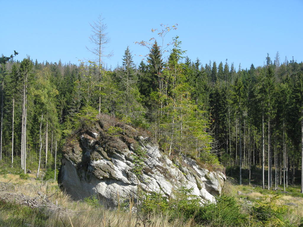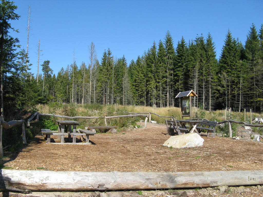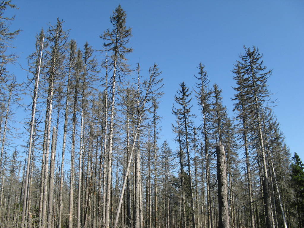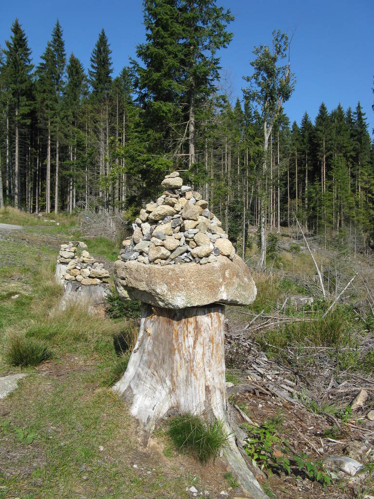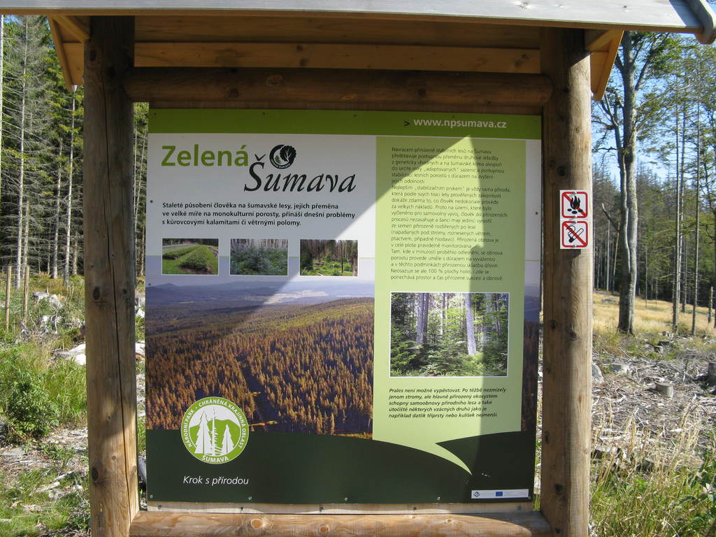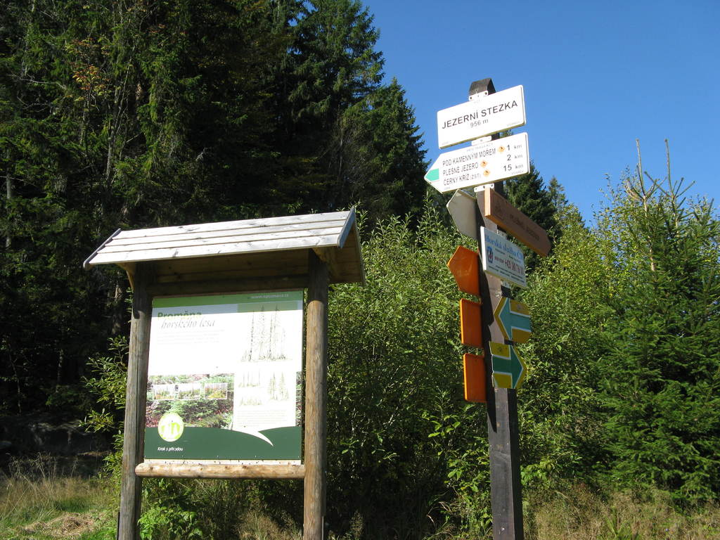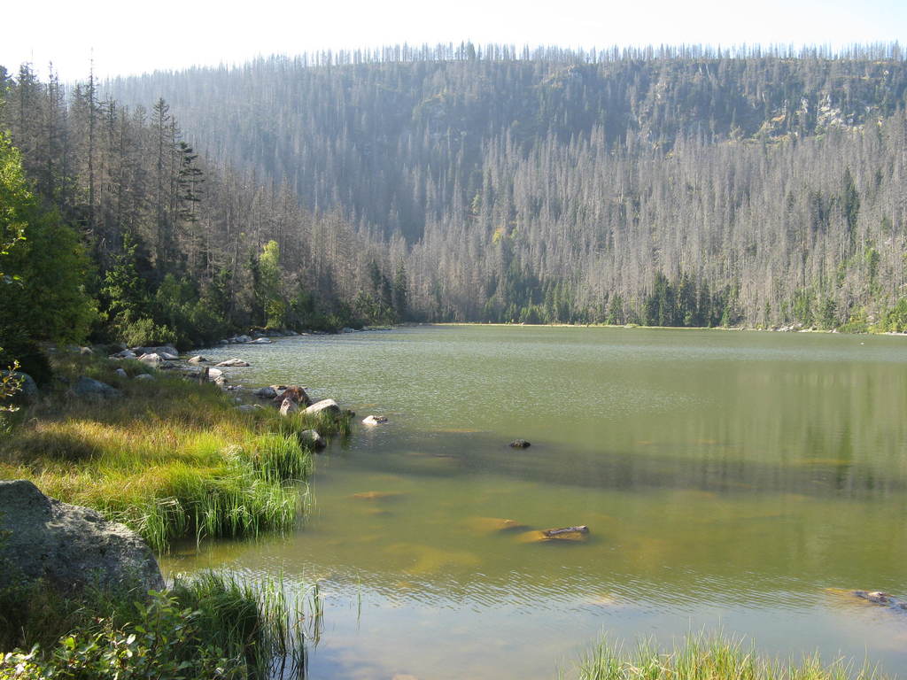 Víkendový pobyt na Šumavě, Černá v Pošumaví u Lipna. Sobotní výstup k Plešnému jezeru a na vrchol Plechý jsme realizovali z Nové Pece. Smrkový les nahoře v okolí Plechého je kompletně zničený kůrovcem. Na rakouské straně už veškerý nemocný a zničený porost vykáceli, takže je tam planina a nové stromy se jim tam nějak nechtějí uchytit. Na naší straně je vše ponecháno v původním stavu svému osudu, dost pěkně je zde vidět, jak kůrovec postupuje stále níž a níž a postupně napadá už i mladé stromky. Vzhledem k tomu, že celá Šumava je téměr jedna velká smrková monokultura, může se takto lýkožrout vesele rozšiřovat dál, protože ho nezastaví žádná přírodní bariéra...