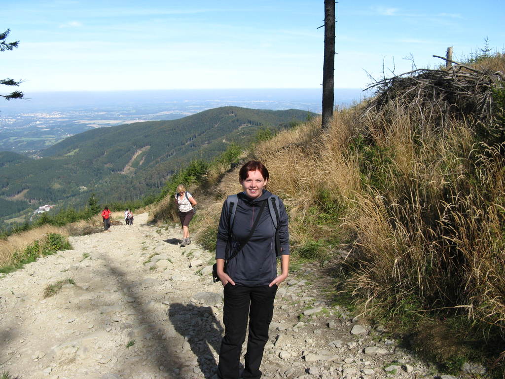 Výstup na Lysou horu.Tam: z Ostravice stále nahoru po červené značce 8,5 km (prý nejtěžší trasa z možných dostupných, málem jsem vypustila duši v tom stoupání:-)). Zpět: po žluté značce směr k hrázi přehrady Šance a zpět do Ostravice (pro změnu prudké a ještě prudší klesání)cca 10 km. Počasí bylo ale nádherné a odměnou za námahu nám byly úžasné výhledy, úplně na horizontu se daly rozeznat dokonce i Vysoké Tatry...