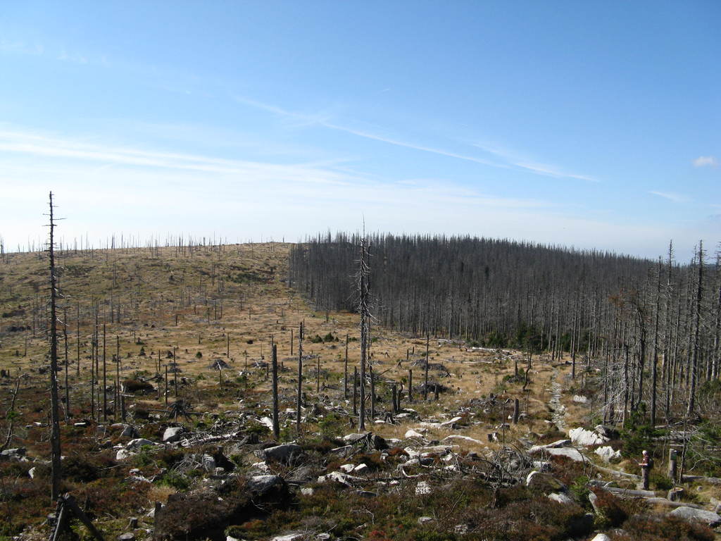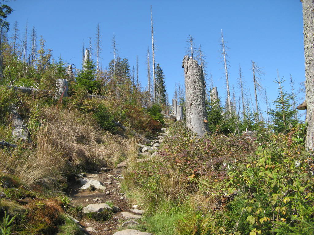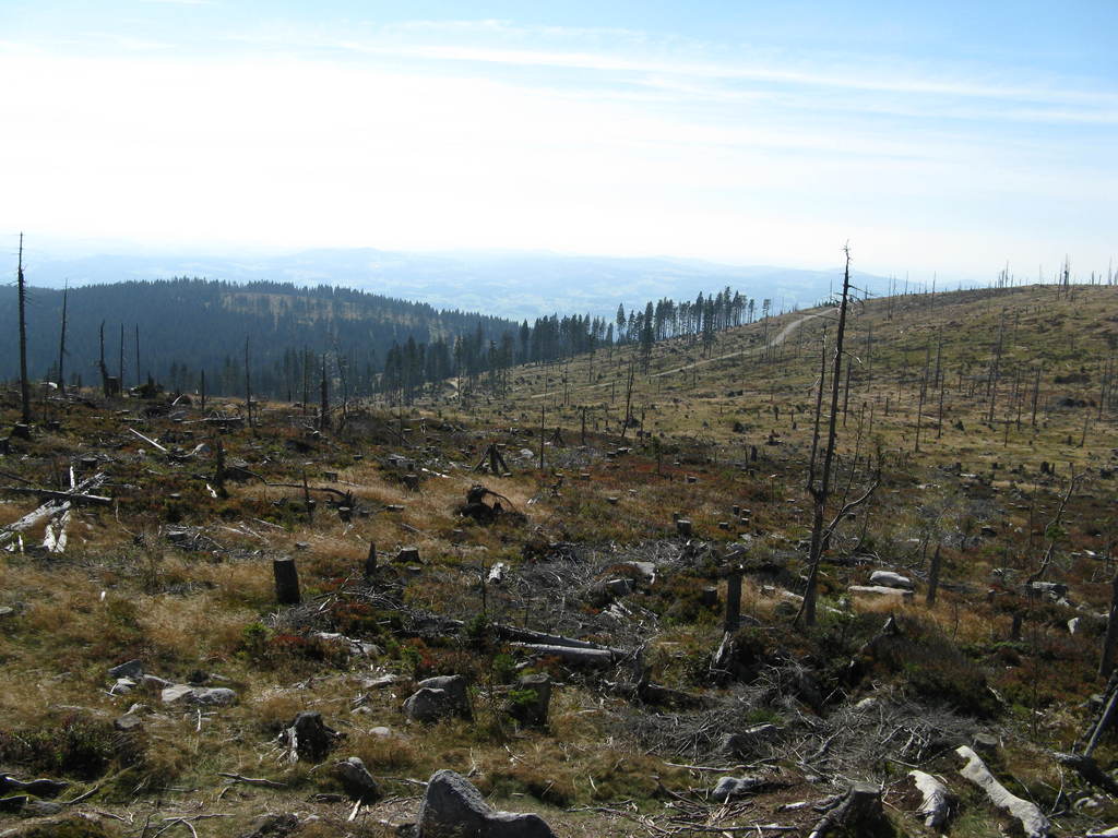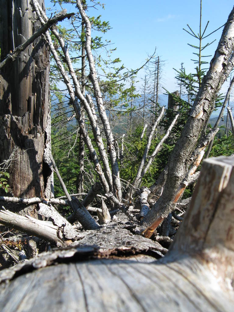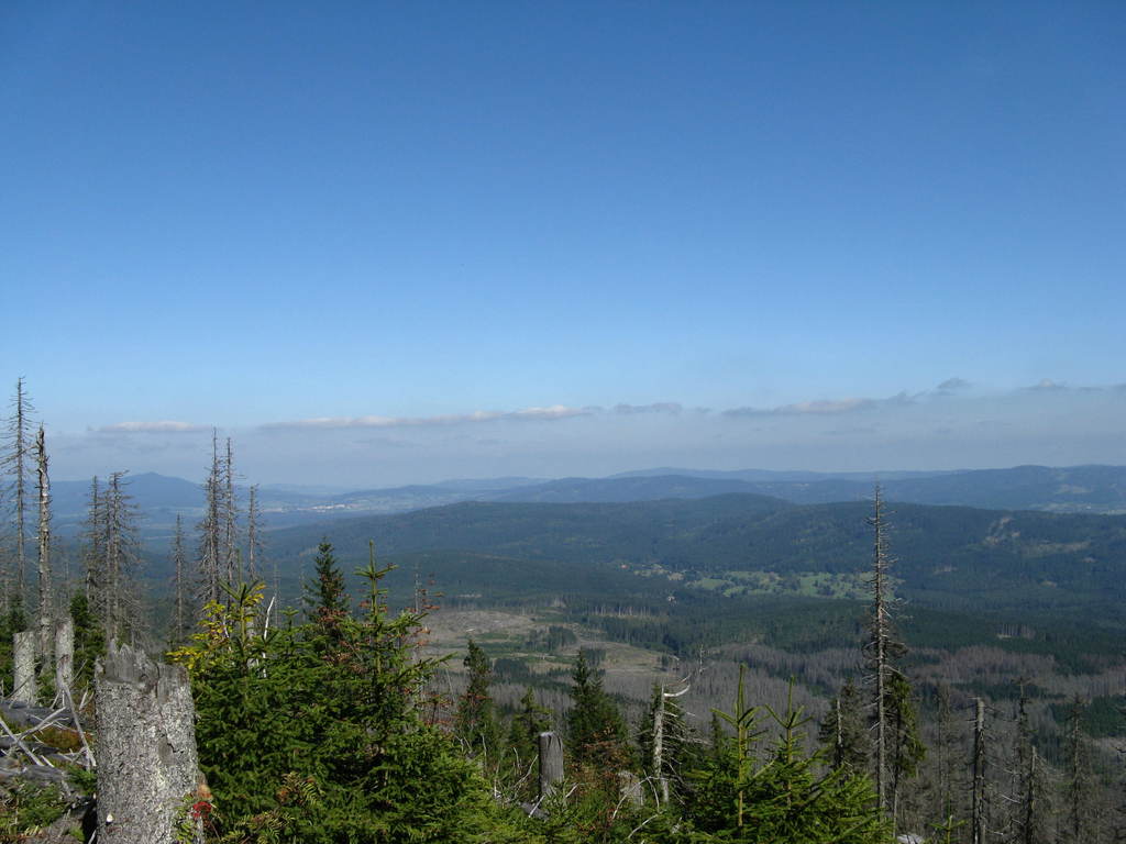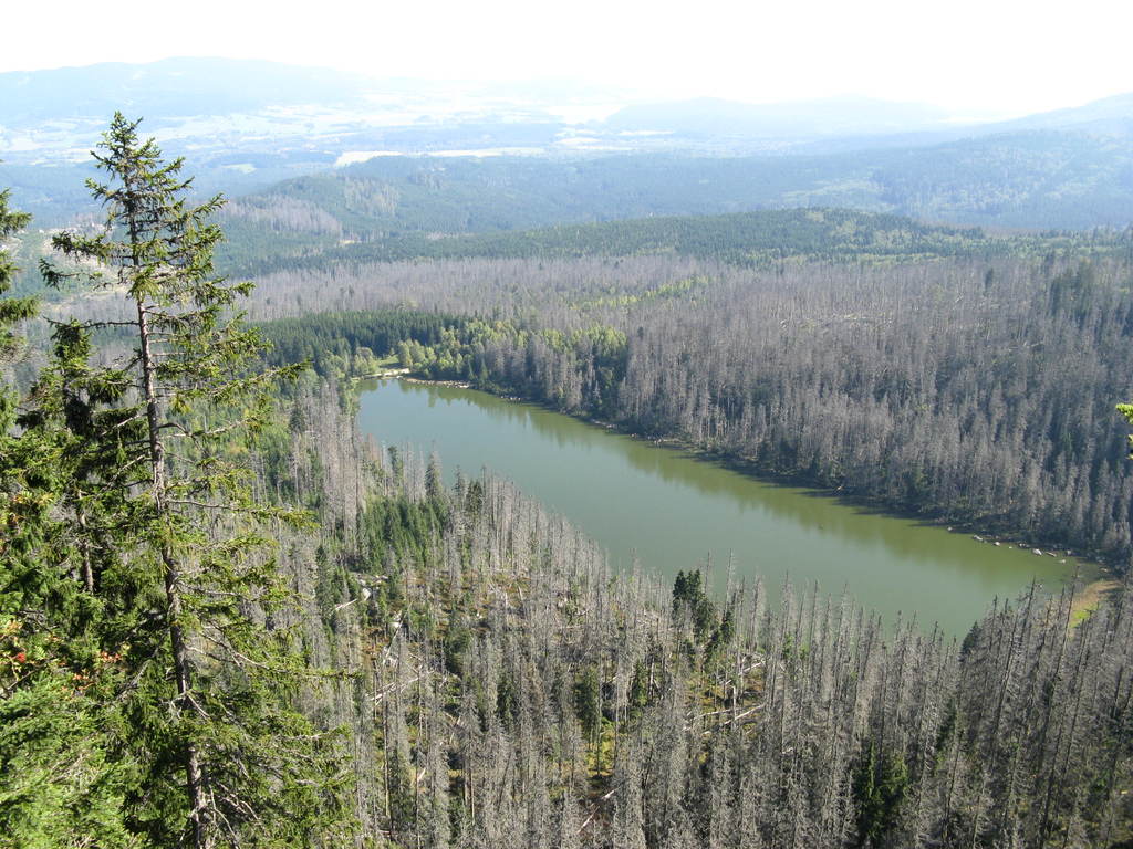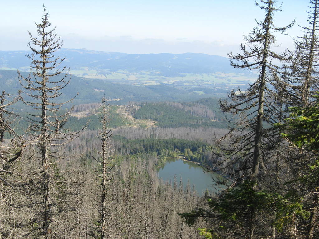 Víkendový pobyt na Šumavě, Černá v Pošumaví u Lipna. Sobotní výstup k Plešnému jezeru a na vrchol Plechý jsme realizovali z Nové Pece. Smrkový les nahoře v okolí Plechého je kompletně zničený kůrovcem. Na rakouské straně už veškerý nemocný a zničený porost vykáceli, takže je tam planina a nové stromy se jim tam nějak nechtějí uchytit. Na naší straně je vše ponecháno v původním stavu svému osudu, dost pěkně je zde vidět, jak kůrovec postupuje stále níž a níž a postupně napadá už i mladé stromky. Vzhledem k tomu, že celá Šumava je téměr jedna velká smrková monokultura, může se takto lýkožrout vesele rozšiřovat dál, protože ho nezastaví žádná přírodní bariéra...